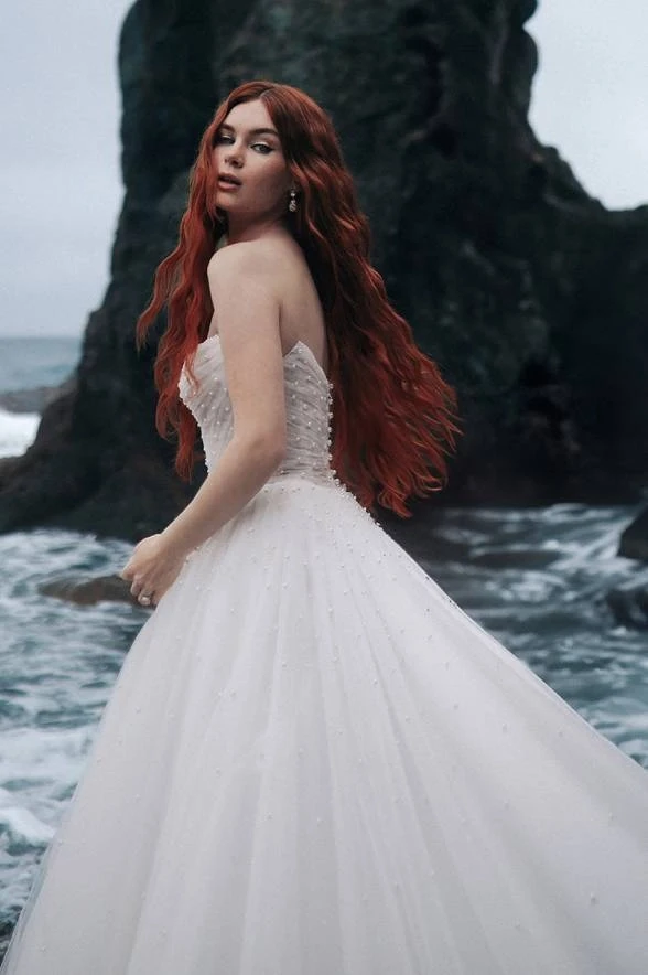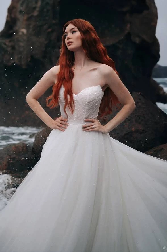 This dress is a love letter to transformation, bold choices, and ocean-kissed romance. It’s a dreamy A-line bridal gown crafted from swiss dot sparkle tulle that glistens like sunlight dancing on waves. The strapless sweetheart bodice is ruched for soft structure, with a sheer panel and exposed boning that add a daring edge. Pearl beading subtly nods to Ariel’s underwater world, while the natural waist and flowing skirt create a figure-flattering silhouette.