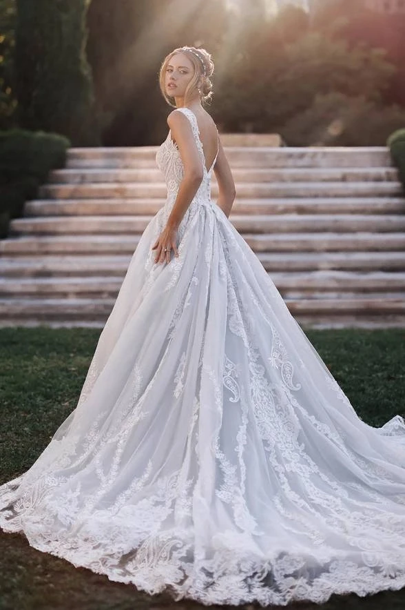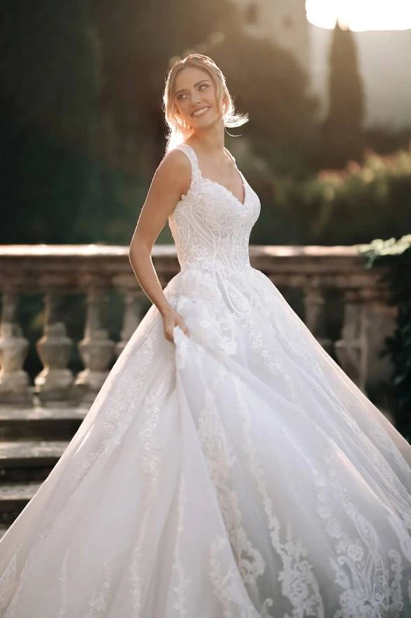 Just like the stroke of midnight couldn’t steal Cinderella’s sparkle, this breathtaking ball gown won’t let you blend into the background. This wedding dress features a graceful v-neckline, delicate cap sleeves, and a basque waistline that gives it that regal edge. Layers of lace and shimmer-infused tulle catch the light with every step - just like her legendary glass slippers.